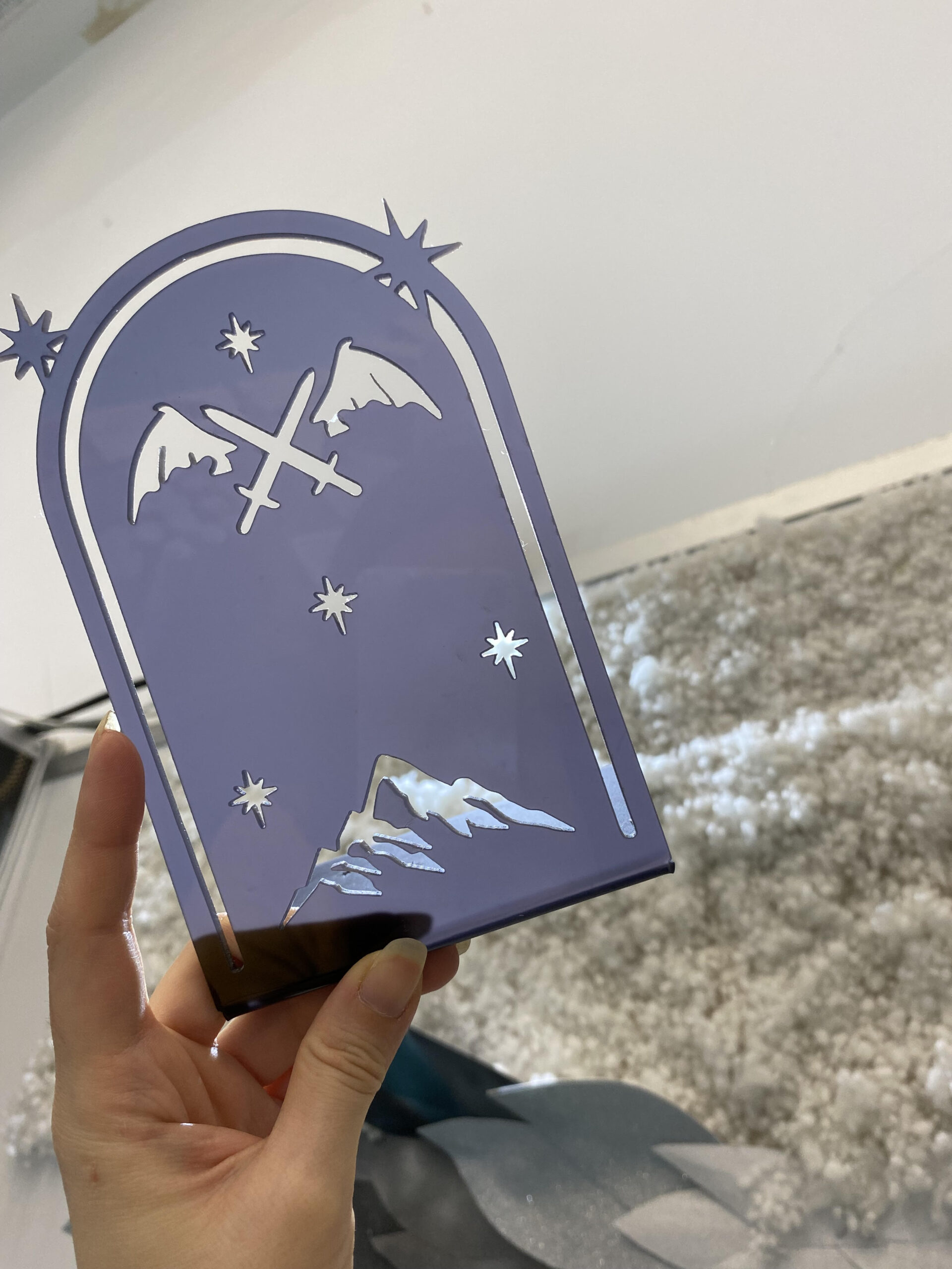Velaris Bookend adds a strong fantasy vibe to any bookshelf. Its color-shifting surface creates a magical look under the light. With dimensions close to 20 cm, it holds books securely and stays balanced with its curved plexiglass base. The cloud and dragon design enhances the fantasy theme.